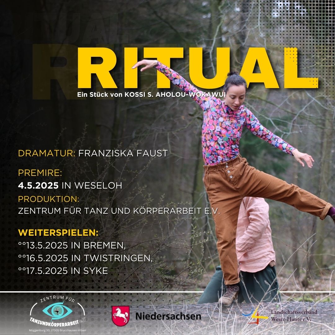 Gemeinsam mit dem Tänzer Kodjo Joseph Adando aus Lomé/Togo entsteht ein Video in der Landschaft Westafrikas, live vor Ort arbeitet er mit der Tänzerin Leila Bakthali, es entsteht eine Verbindung zwischen der Landschaft in Togo und in Niedersachsen, eine Welt. Eine westeuropäische Perspektive einer Tänzer*In trifft auf traditionell, afrikanische Vodoo-Weisheit, daraus entwickelt sich ein besonderes Duo im niedersächsischen Hachetal. Die zeitgenössische Antwort wird das „Ritual“.